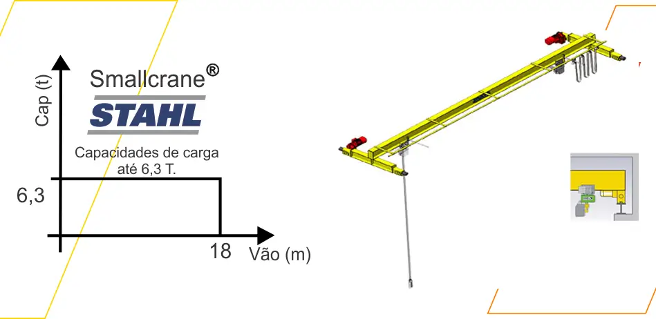 A ponte rolante STAHL modelo SMALLCRANE é composta por uma única viga de perfil laminado especial, obtendo-se assim um equipamento de baixo peso próprio, com uma excelente relação custo x benefício. Além disso, torna-se uma solução ideal para materiais leves, com capacidades até 6.300kg e vãos até 18m. Outro grande benefício é a facilidade no transporte e montagem deste modelo de equipamento, já que as cabeceiras já vem soldadas na viga da ponte, o que reduz consideravelmente os custos com estes dois itens.