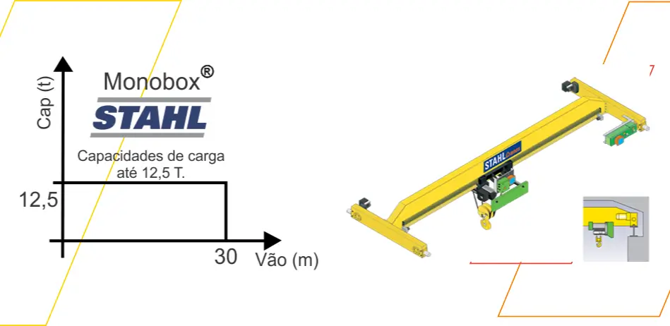 A ponte rolante STAHL modelo MONOBOX® é composta por uma única viga soldada, do tipo “caixão”. Pode ser equipada com talhas elétricas de corrente para capacidades de até 6.300kg ou com talhas elétricas de cabo de aço para capacidades até 12.500kg e vãos de até 30 metros. Esse range é fruto de estudos de engenharia desenvolvidos pela STAHL através da análise de elementos finitos, que possibilita obter a melhor performance do aço a serviço da estrutura da sua ponte rolante.