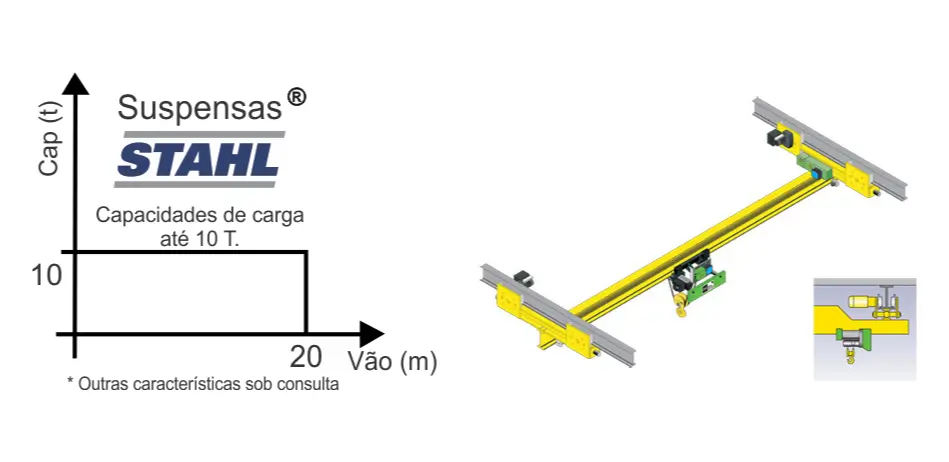 A ponte rolante STAHL modelo SUSPENSA translada na aba inferior da viga de rolamento, a qual pode ser montada diretamente na estrutura do prédio, aproveitando assim o máximo da altura disponível e eliminando a necessidade de estrutura auxiliar fixada no piso. As aproximações laterais do gancho são as menores do que qualquer outro tipo de construção de ponte rolante, pois a viga principal avança além dos centros do caminho de rolamento, possibilitando o máximo aproveitamento da largura do prédio. Outra particularidade desta construção é a possibilidade de interligação com outras pontes rolantes ou monovias utilizando-se de um único mecanismo de elevação e translação da carga.